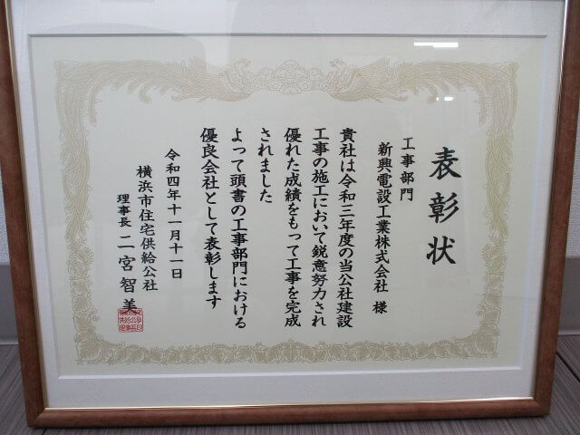 令和4年11月11日、横浜市住宅供給公社様より「工事等優良会社表彰」を受賞いたしました。
